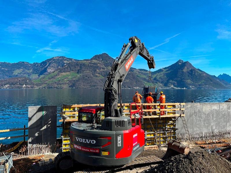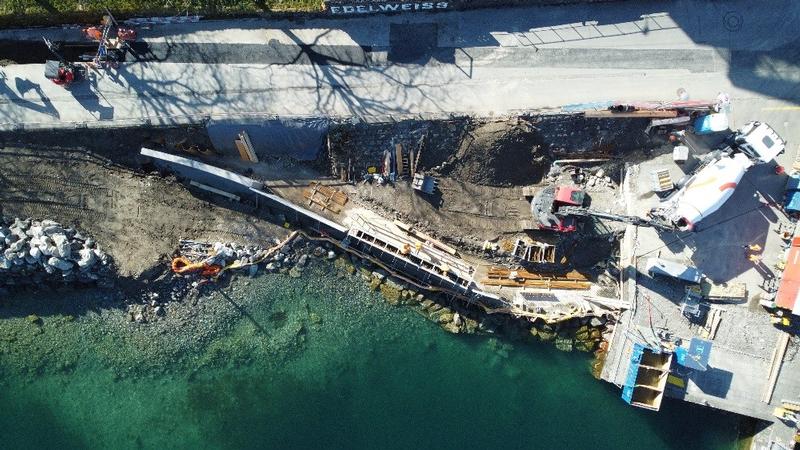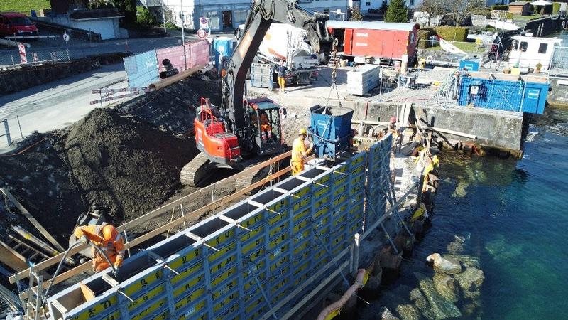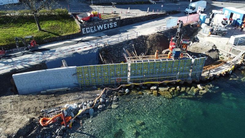 Zurzeit laufen die Schalungs- und Betonierarbeiten der Stützmauer mit Matrizeneinlage in Natursteinmauerwerk-Struktur, dabei entsteht ein neuer Seezugang mit Natursteinquader.