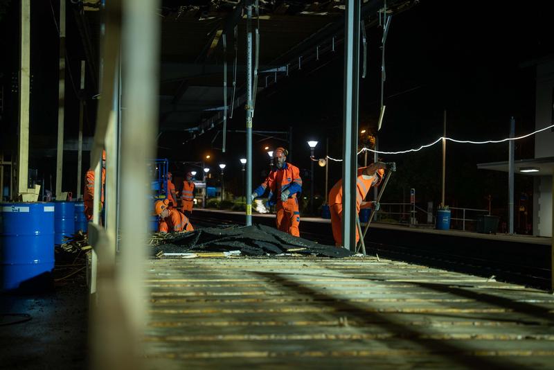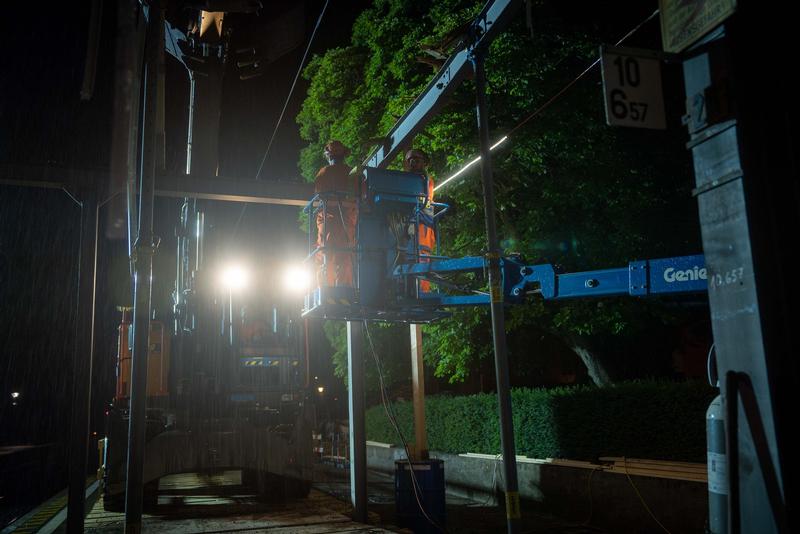 In den letzten Wochen haben wir mit den Vorbereitungsarbeiten begonnen. Unter anderem mit der Installation provisorischer Betonfässer für die Beleuchtung sowie der Einrichtung temporärer Kundencenter auf beiden Seiten des Perrons. Nun steht der Abbruch des Perrondaches an, der in zehn Nachtschichten durchgeführt wird. Dabei werden auch das Wartehaus und ein Velounterstand abgerissen.