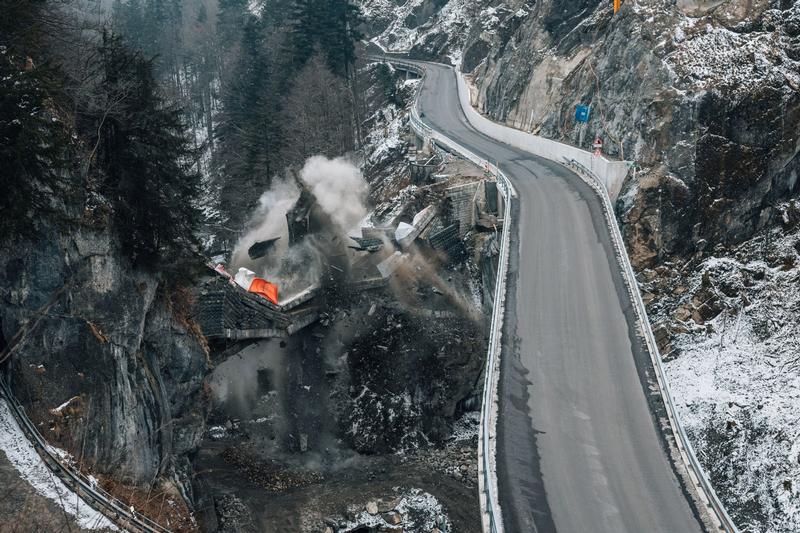 Eine neue Ära beginnt! Die alte Chlusbodenbrücke ist Geschichte. Mit einem kontrollierten Sprengvorgang der Gasser Felstechnik AG, bei dem 24 kg ziviler Sicherheitssprengstoff zum Einsatz kamen, wurden 81 präzise Sprengbohrlöcher gesetzt, um das Bauwerk sicher zu sprengen. Seit Dezember 2024 ist die neue, zweispurige Ersatzbrücke über die Lammschlucht in Betrieb. Die alte Brücke entsprach nicht mehr den heutigen Sicherheits- und Verkehrsanforderungen und hätte hohe Unterhaltskosten verursacht.